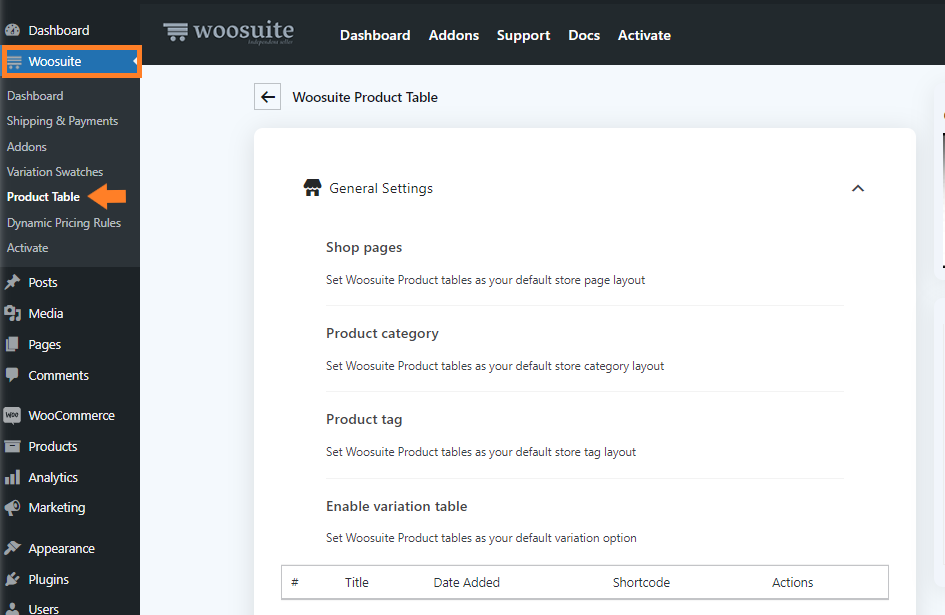 Navigate to Woosuite » Product Table from your WordPress dashboard.